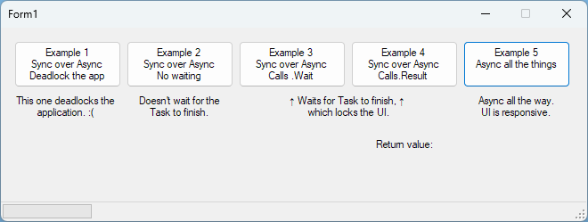 The best option though, when you can, is to mark everything async on up the chain. Since event methods can be marked async in WinForms, it means a really small change in my really small example. Just “await” the async method and then mark the click event as async too, and watch the magic happen.