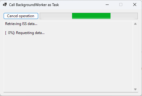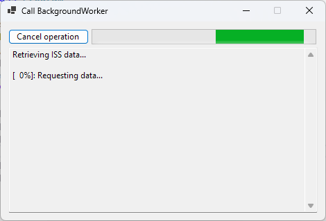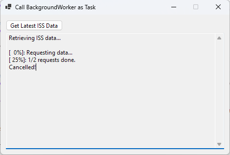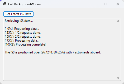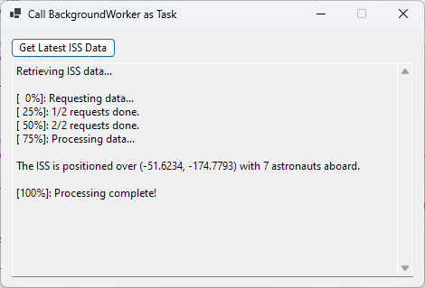 And here’s how we might call the new SpaceTask class from anywhere in the application that’s interested in ISS data. There’s nothing in the code below that suggests we’re still dealing with a BackgroundWorker. For all intents and purposes, it’s just a Task. The underlying details are hidden by the SpaceTask