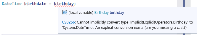 Being able to define our own implicit and explicit conversions is a powerful tool for .NET developers, but it should be used carefully. In particular, if there’s any chance of data loss, use an explicit
