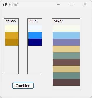 publicclassColorSwatch{publicIEnumerable<Color>Shades{get;}publicstringName{get;privateset;}publicColorSwatch(stringname,IEnumerable<Color>shades){Name=name;Shades=shades.ToList();}publicstaticIList<Color>operator*(ColorSwatchcs1,ColorSwatchcs2){varcolorMatrix=newList<Color>();varamount=0.5;foreach(vars1incs1.Shades){foreach(vars2incs2.Shades){// Thank you Timwi.. stackoverflow.com/a/3722337byter=(byte)(s1.R*amount+s2.R*(1-amount));byteg=(byte)(s1.G*amount+s2.G*(1-amount));byteb=(byte)(s1.B*amount+s2.B*(1-amount));colorMatrix.Add(Color.FromArgb(r,g,b));}}returncolorMatrix;}}