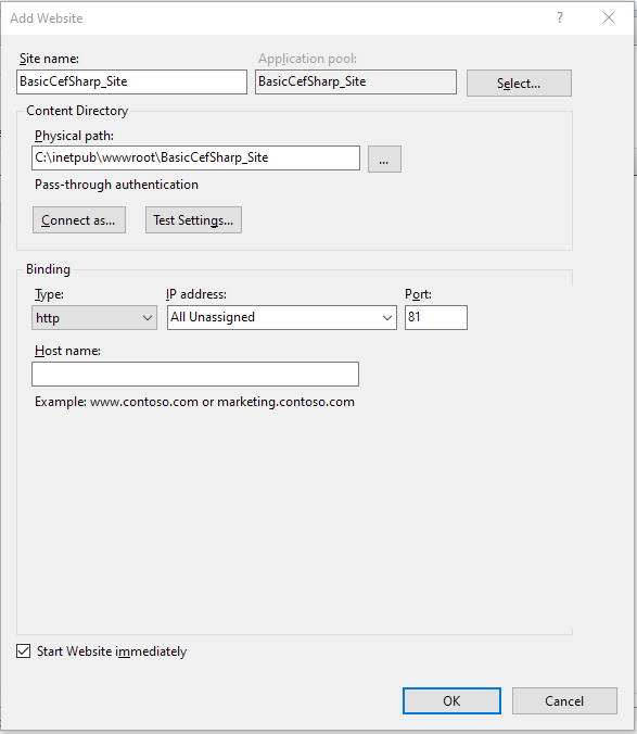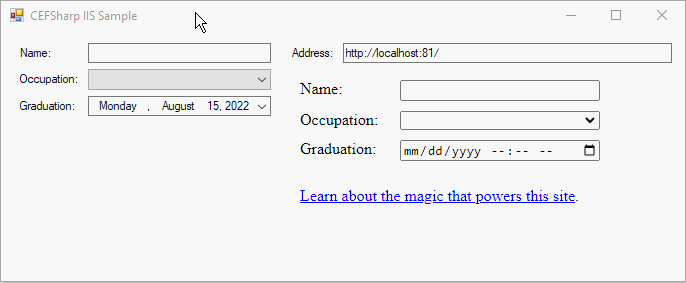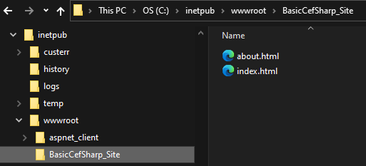 This time we’ll host the same page in IIS and see how CEFSharp can still interact with it. I won’t give a whole overview of IIS, but if you want to try it yourself, here’s a few steps.