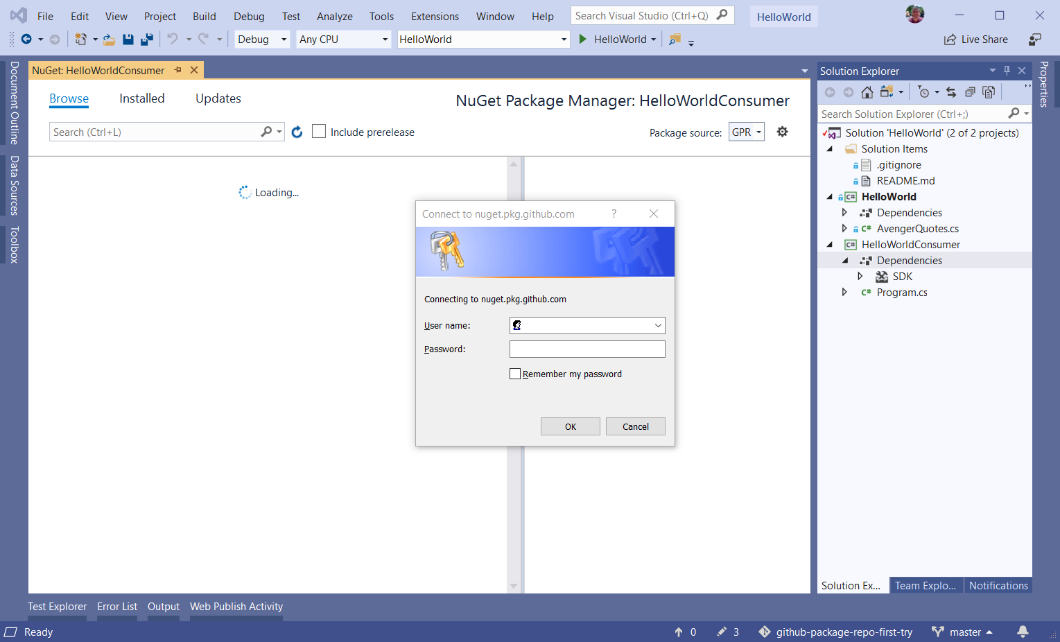 When I initially tried to list packages from the GPR in Visual Studio, it prompted me for a password. I tried my GitHub password, then the token string - nothing. The error message in the console was… less than helpful.