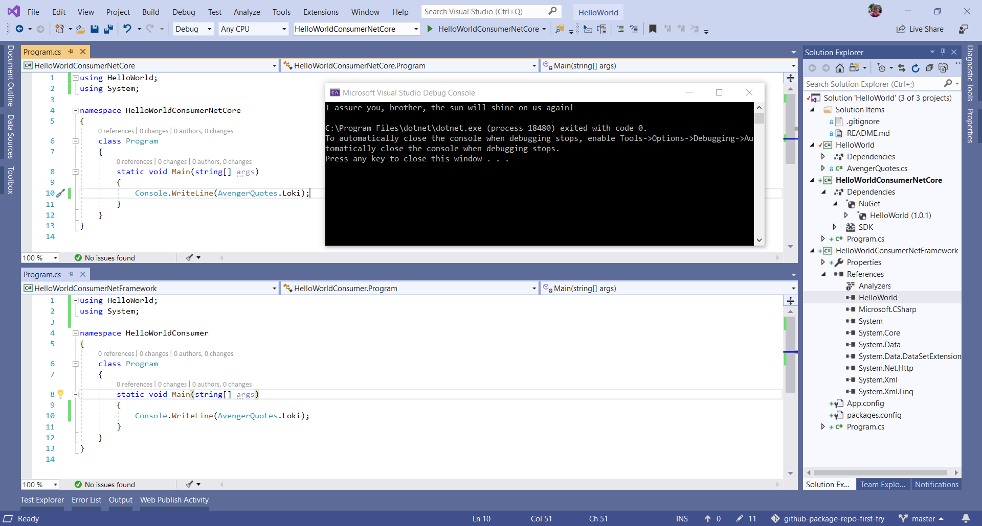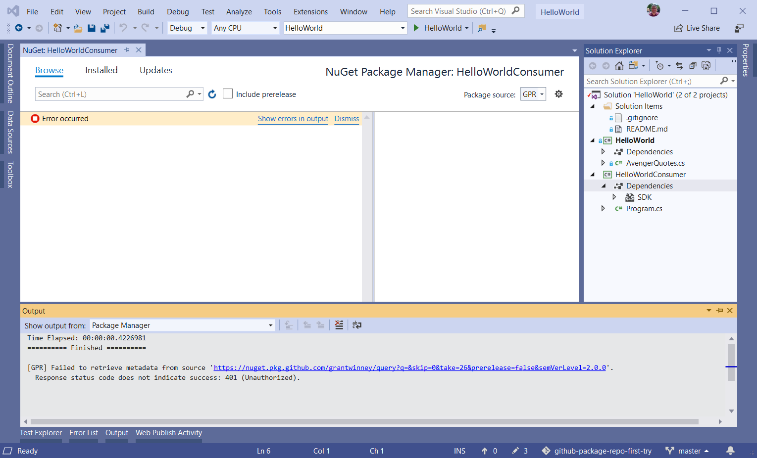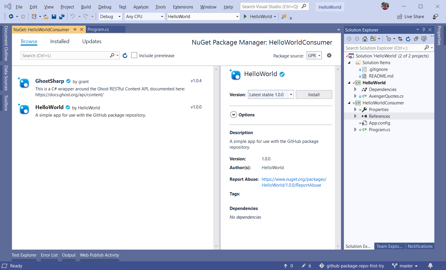 In order to do this yourself, you’ll need something to publish. If you don’t have a project in mind, just make a simple console app in VS that prints out “hello world!” and push it to GitHub. I created a one-off repo called “github-package-repo-first-try” for this purpose.