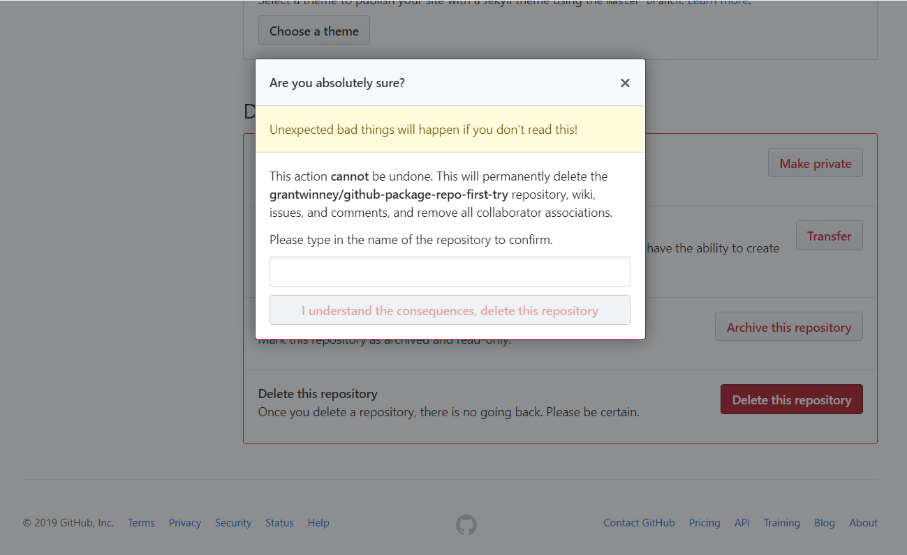 GitHub allows you to delete a repository, and repositories contain your packages. So what happens then? I tried deleting (but didn’t) the repository I was using to test this, and it sure seems like it would. Do the packages float around detached? 😕