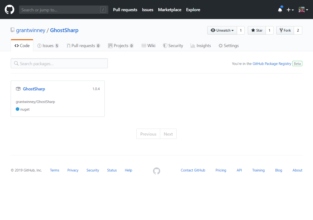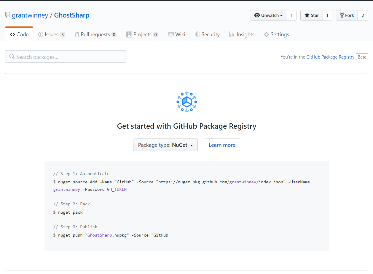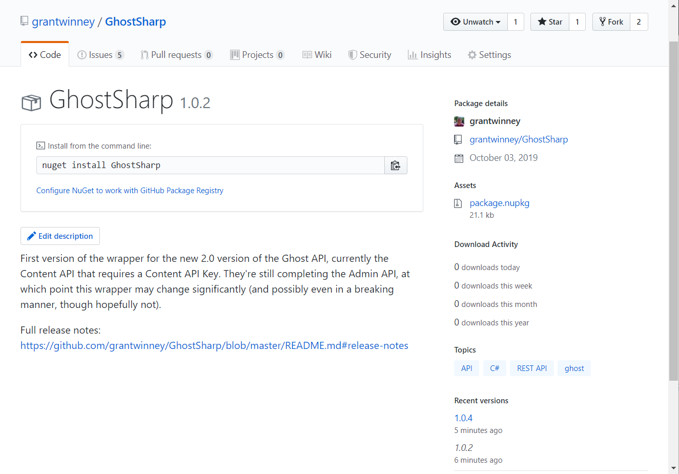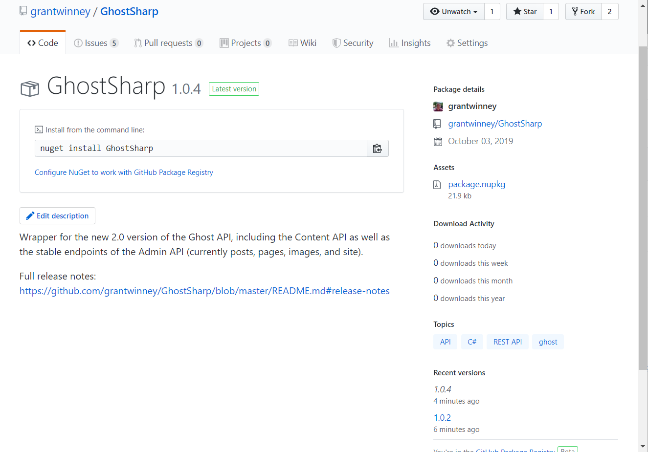 That’s it! Here’s what it looks like on GitHub after pushing packages for my GhostSharp project. I uploaded two versions of GhostSharp - 1.0.2 and 1.0.4 - and you can see them listed in the lower-right corner.