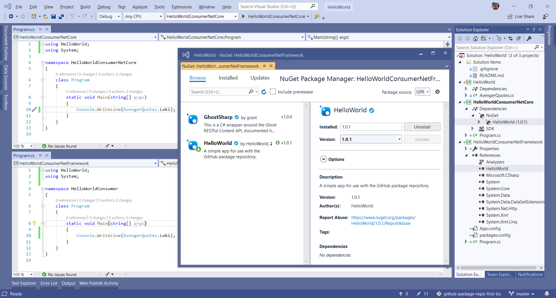 This, unfortunately, was a crappier experience than I’d hoped for. I’m not sure if it’s a problem with the GitHub Package Registry or something else, but referencing the new package from GitHub didn’t work right away. Let me back up a few steps - here’s how things should work.