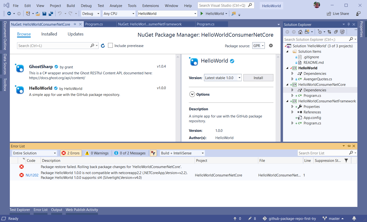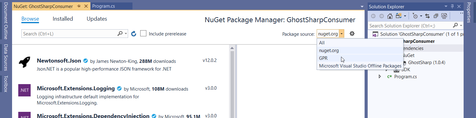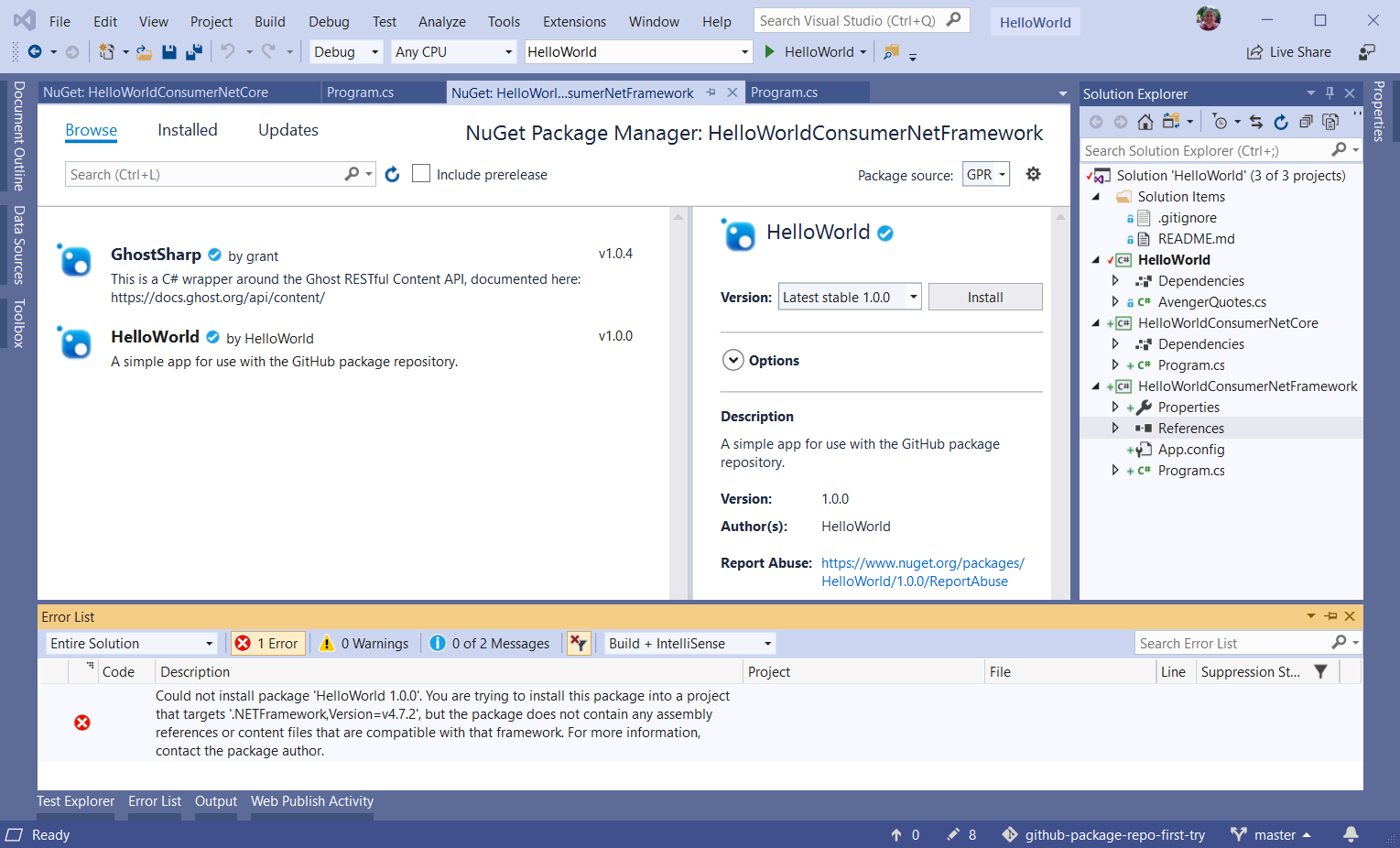 Create a new project, which you’ll use to consume the package you just pushed to the GPR. Or if you’re using the project I created, there’s a couple in there already - one targets .NET Core 2.2 and the other targets .NET Framework 4.7.