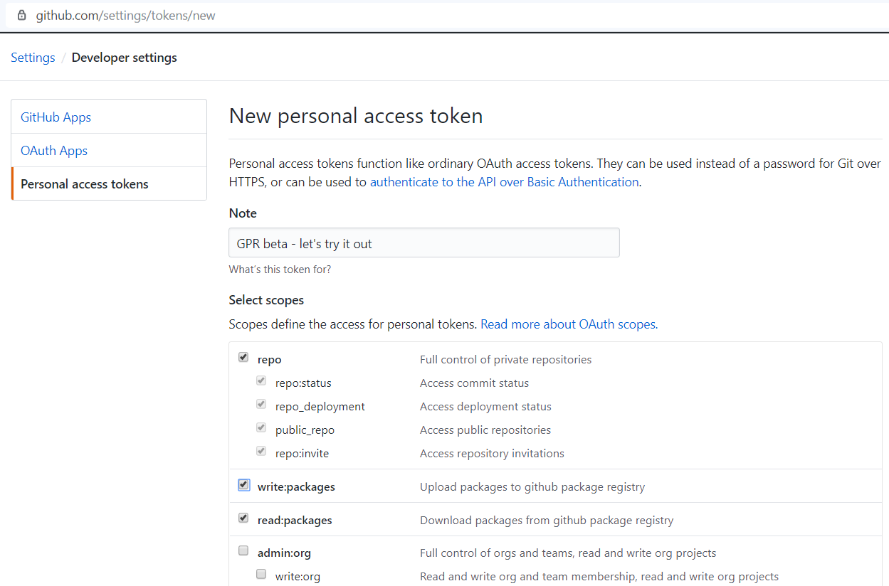 The first step, no matter which language you’re using to connect to the GPR, is to create a personal access token. Think of it this way - you want a third party to be able to access your data on GitHub. You could just give them your username and password and trust that they’ll only access what they need. Don’t do that. Ever! 🤬