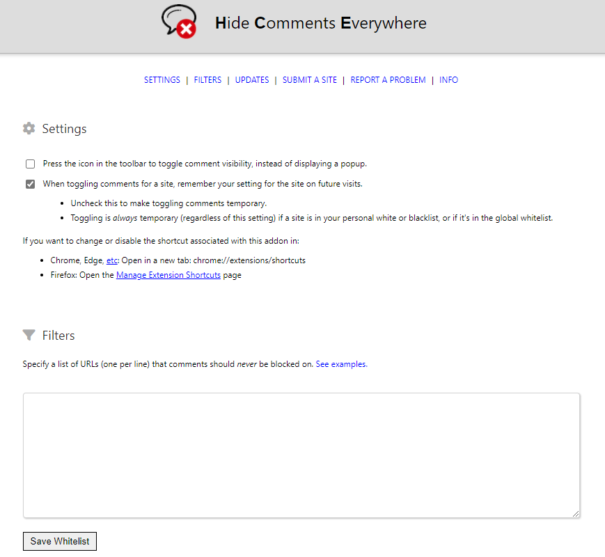 - Then, it checks your personal whitelist. If you’ve included a site that should always show comments, it allows them even if you previously clicked the “toggle” button to hide them.