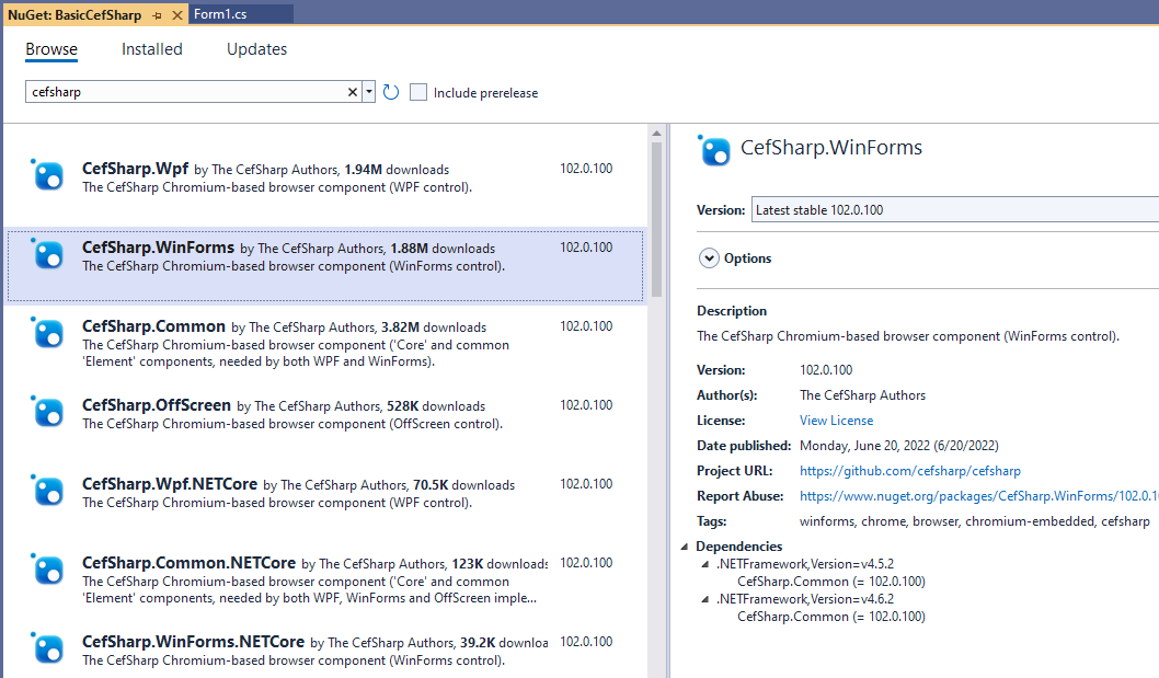 Fire up a new WinForms app, then search for CefSharp in the NuGet gallery and add the one for WinForms.