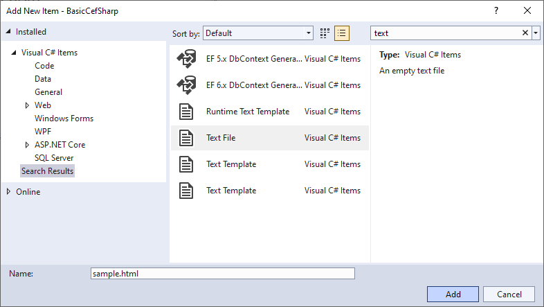 Add a new file to your project, choose “text file”, and name it “sample.html”. Throw some html in there, and maybe some JavaScript. Anything will do. There are few absolute rules in web development, and having 20 ways to do any one thing is something I love as a developer. It’s just.. it’s great. 😢