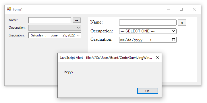 Hosting a webpage inside a WinForms is just.. it’s.. a little underwhelming tbh. I mean, why not just open it in a web browser unless there’s a reason for it living in the WinForms app? And there’s only a reason if the two can actually interact somehow. Let’s look at a couple ways to do that - the first is handlers.