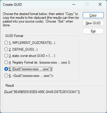 If you’re interested in reading more about what goes on under the covers to create them, Raymond Chen’s article should pique your interest.. or make your brain hurt. Personally, I’m not so interested in how they’re calculated, but how I can easily generate one (or several) when I need it.
