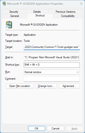 There’s a tiny utility for generating GUIDs that gets installed with every version of Visual Studio, going back to at least VS 2005 (the earliest I have installed). It’s accessible in the VS menu but it’s also a stand-alone exe, so you can just pin it or create a shortcut to it, and then assign a shortcut key to it if that’s what you want.