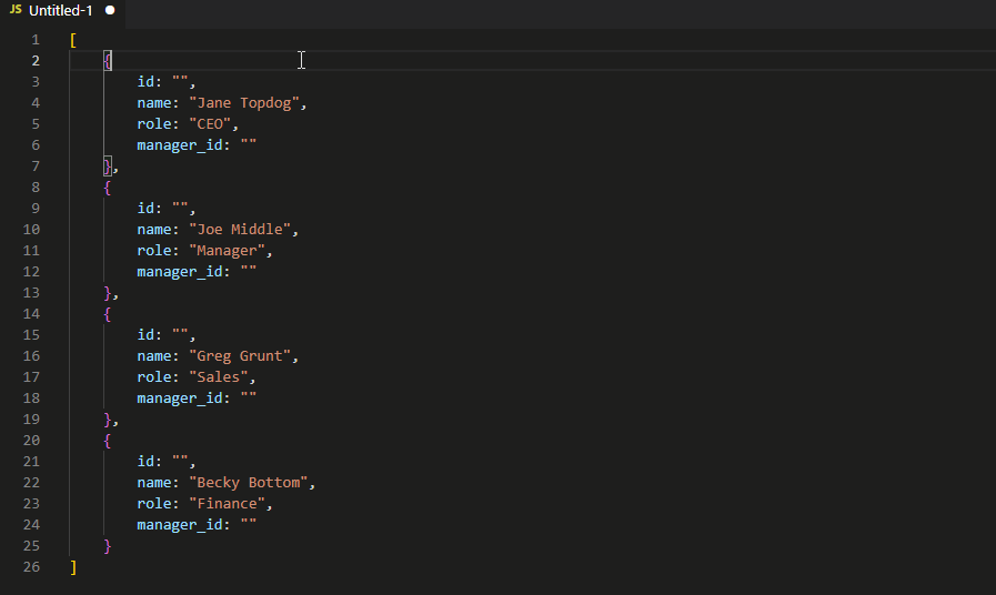 Here’s an example, that definitely only took 30 seconds to create and that I certainly didn’t have to re-record 5 times because I kept pressing the wrong keys. Notice how the “manager_id” gets the same value as the manager’s “id”, but then the two employees get different values for their IDs, depending on which command is selected. Convenience!