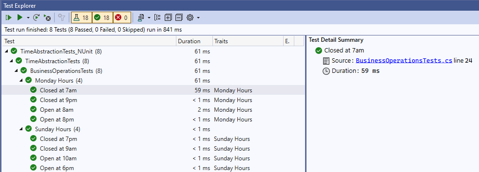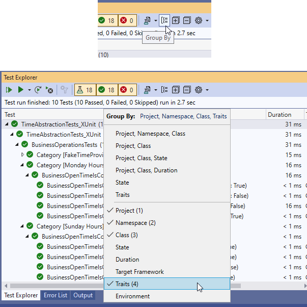 Unrelated note: The eagle-eyed reader might’ve noticed the above tests are grouped by category. You can set category names (aka “traits”) on your xUnit tests, and then choose to “Group By” those traits in the test explorer pane. It’s a nice way of organizing things a bit.