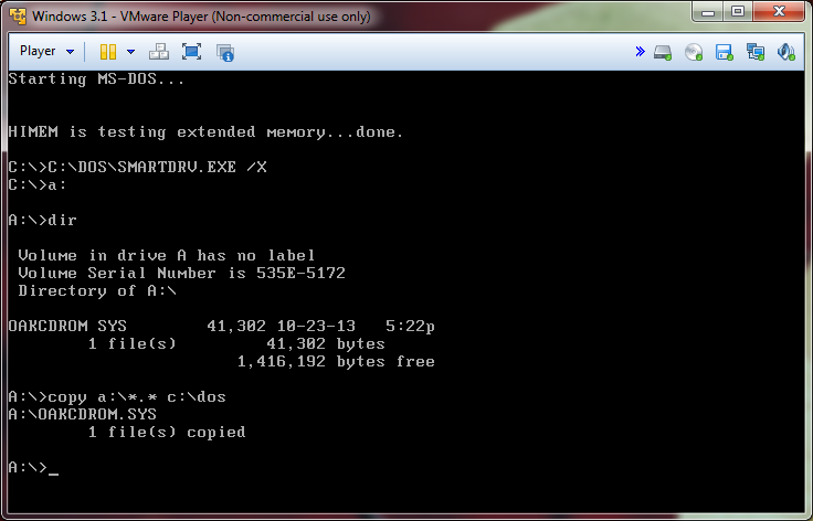 DOS doesn’t support CDs right out of the box, so we’ll need a driver. I used oakcdrom.sys, a generic CD-ROM driver. At this point, all we’ve got access to is a floppy drive.