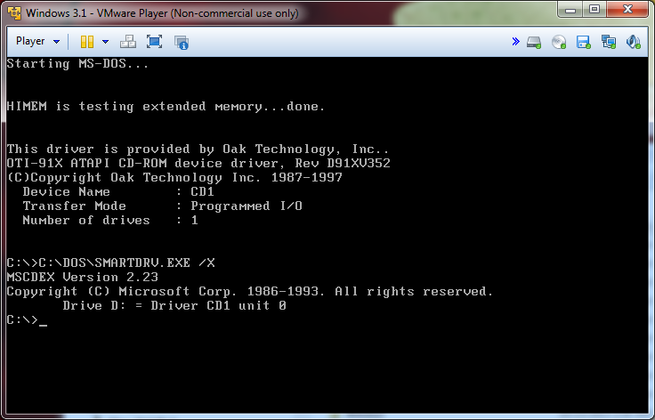 With the CD-ROM now recognized and the Windows 3.1 disk mounted, you can boot up into DOS and type D:
