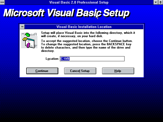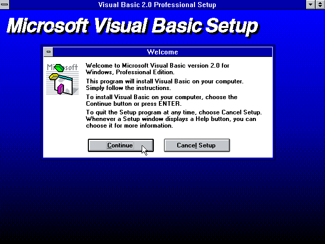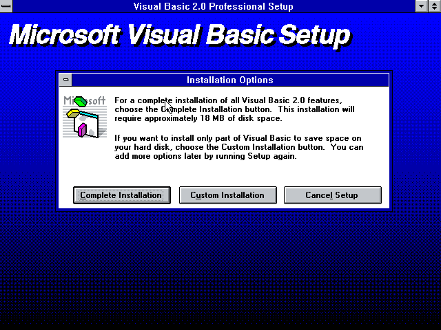 Here’s Visual Basic 2.0. Woah. Okay, that one’s improved in 20 years. Notice that a complete installation will require 18 MB! (gasp)