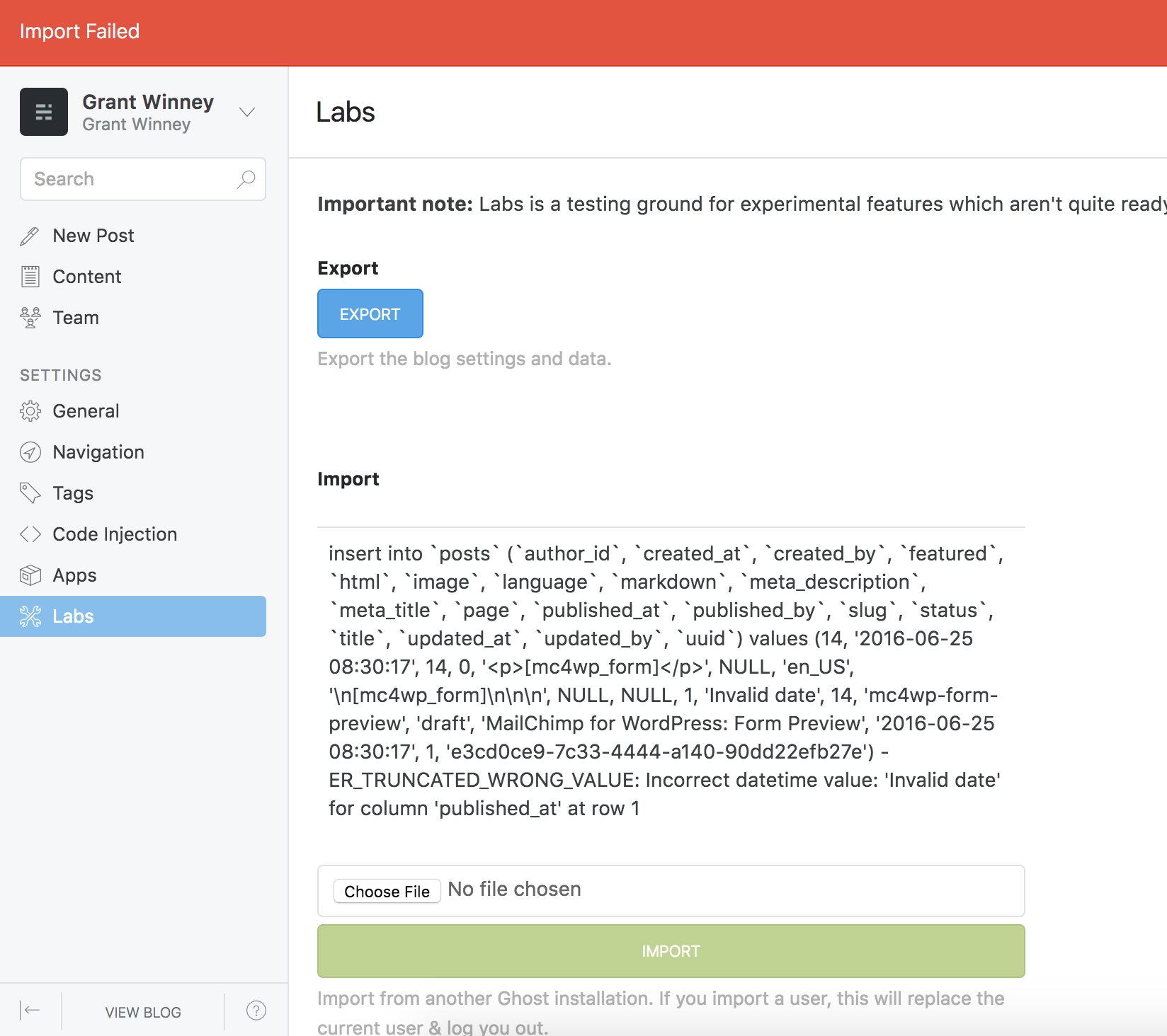 and create a new account. From there, I opened the “Labs” section and attempted to import the file, but it kept failing. It took awhile to realize that the list of messages was not of successfully imported files but exactly the opposite - a list of failures and the reason(s) why. Several of my draft posts were missing titles and one had a missing date.