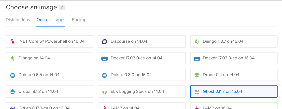 I mentioned the easy route - Ghost(Pro) - but I’m trying to minimize costs so I went the self-hosting way. I’ve been using DigitalOcean for several years so I stuck with them - they even provide a one-click droplet for Ghost that makes it super-easy to get up and running with the latest version. Press the “Create Droplet” button and select Ghost from the “One-click apps”. This is a huge convenience over deploying Ghost yourself.