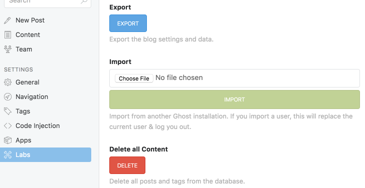 The other option, which I didn’t try but you may want to if you’ve made changes to your posts after you uploaded them into Ghost the first time, is to click the “EXPORT” button on that same screen to export your posts from Ghost. Update that file and then delete all your content and re-import the updated file.
