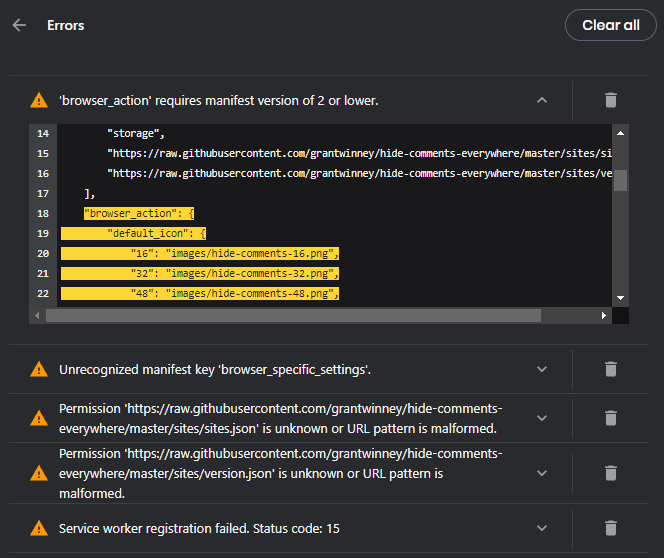 That last error gave me pause. What does “service work registration failed” mean? Service workers replaced background pages, which isn’t cryptic, but the error itself is so vague. Why did it fail? Well, reason 15 of course! Including the error number in there required a bug fix, apparently, and oh boy what a good time that would’ve been to toss some more descriptive text in there. I never did find a source for what the numbers mean, but while I was flailing around for a fix, they kept switching between 3 and 15.