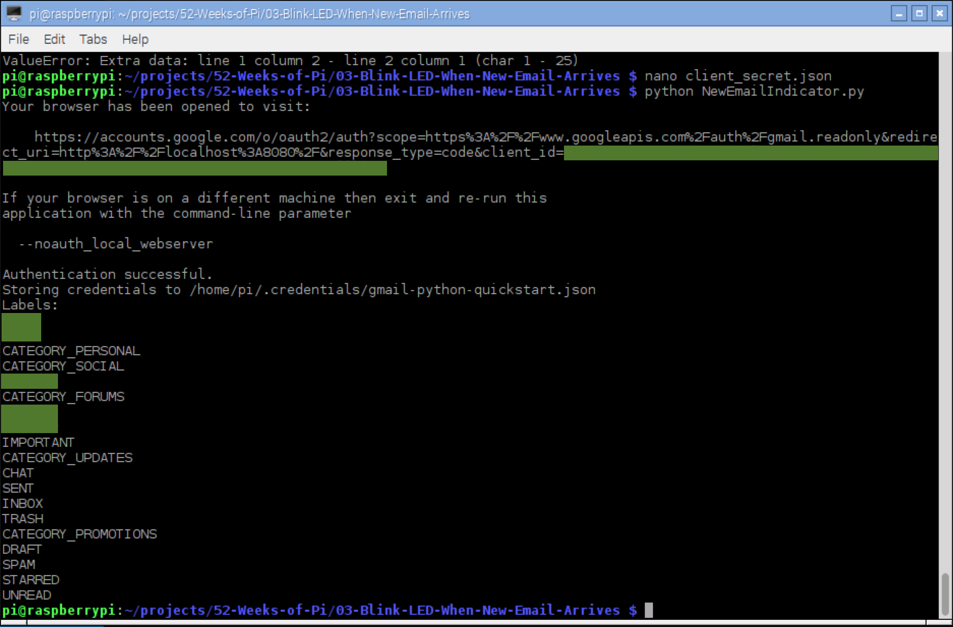 Most of their script is just about authenticating to Gmail, so don’t touch any of that. The following two lines got the list of labels above, and those are the ones we’ll change.