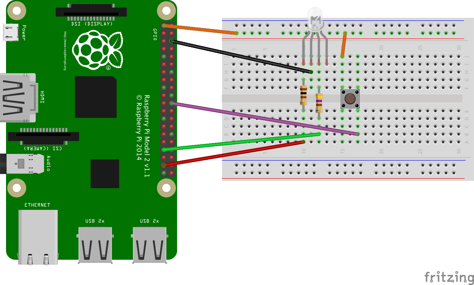 The button is connected to 3.3v and pin 22, which is set to input. When the button is pressed, it’ll change a value that makes the flame brighter and more yellow again.
