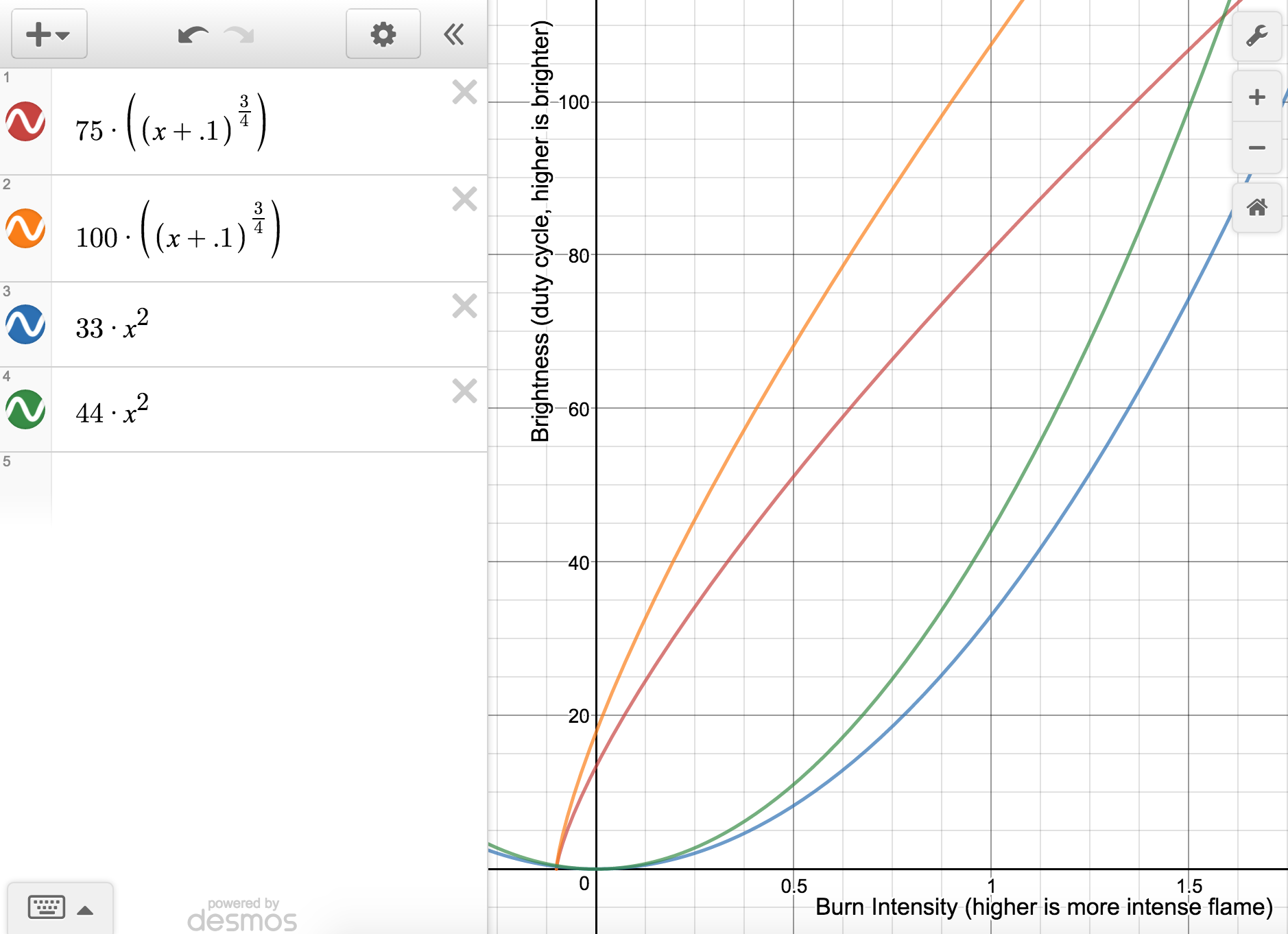 My first actual attempt was something like that; then I just kept hacking away at it until I had something that sorta worked, but not well. As the LEDs got dimmer, there was too much green, making the flame look odd. I needed to see what the algorithm actually looked like, and for that I turned to an online graphing calculator by Desmos.