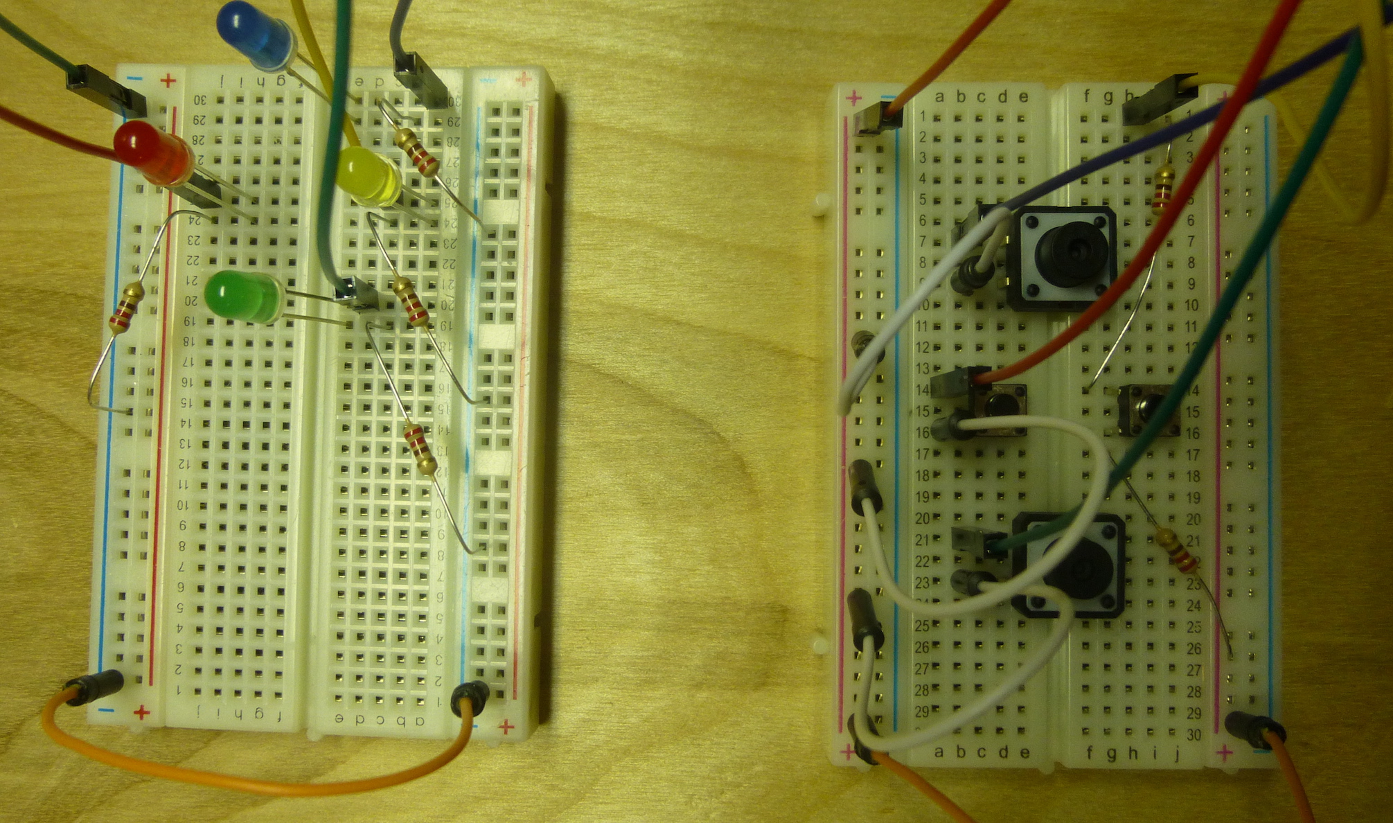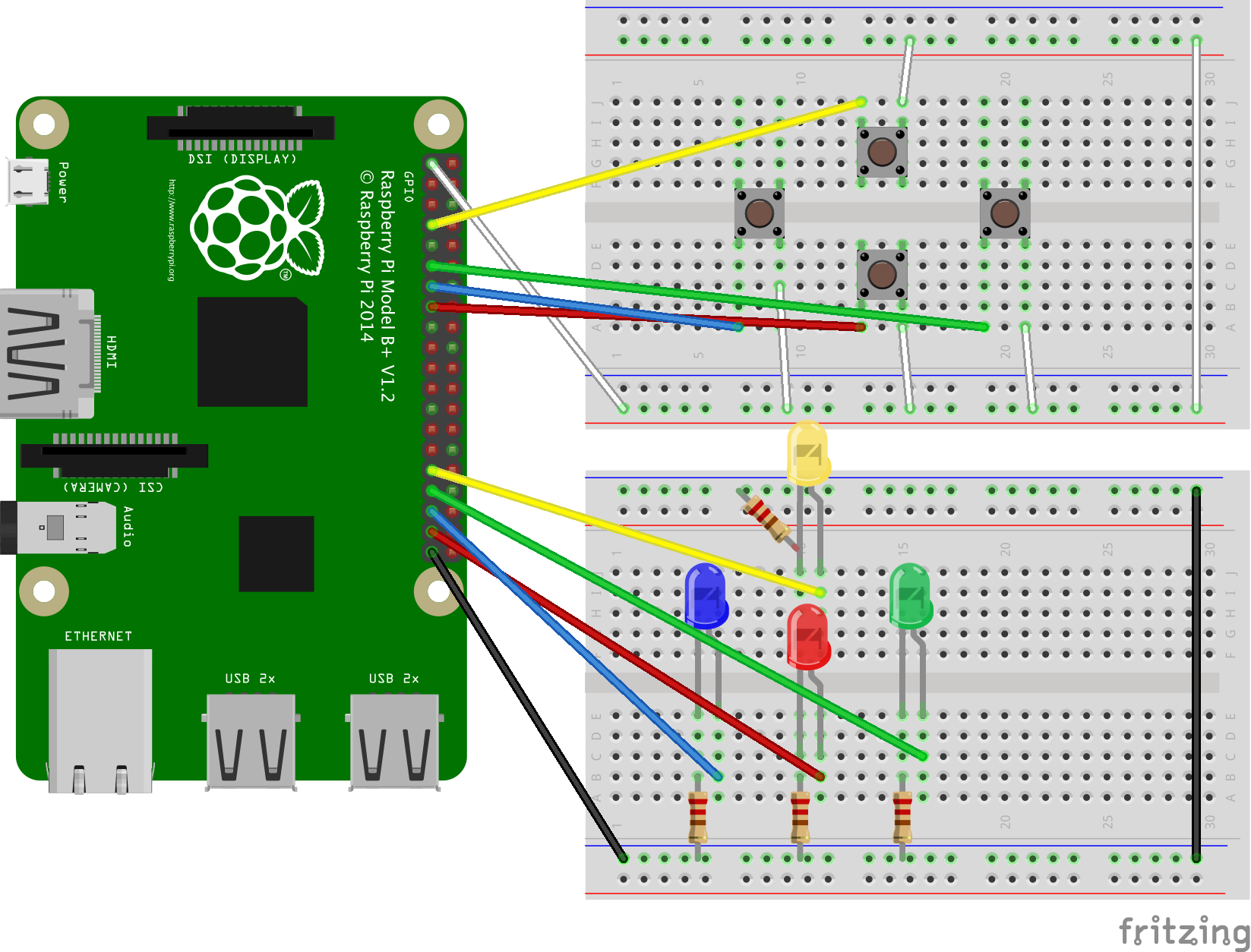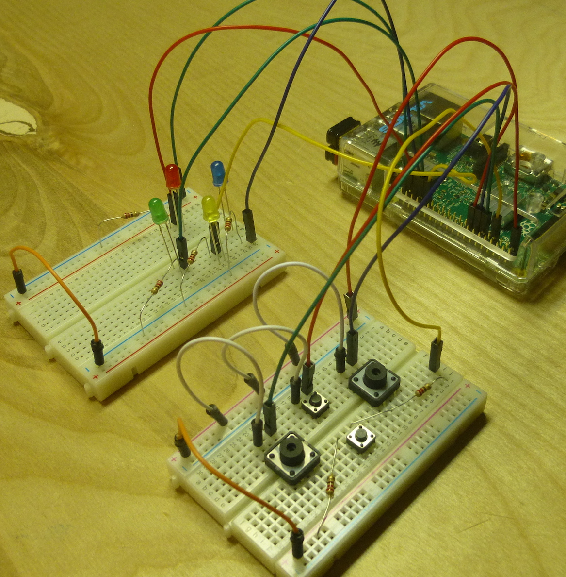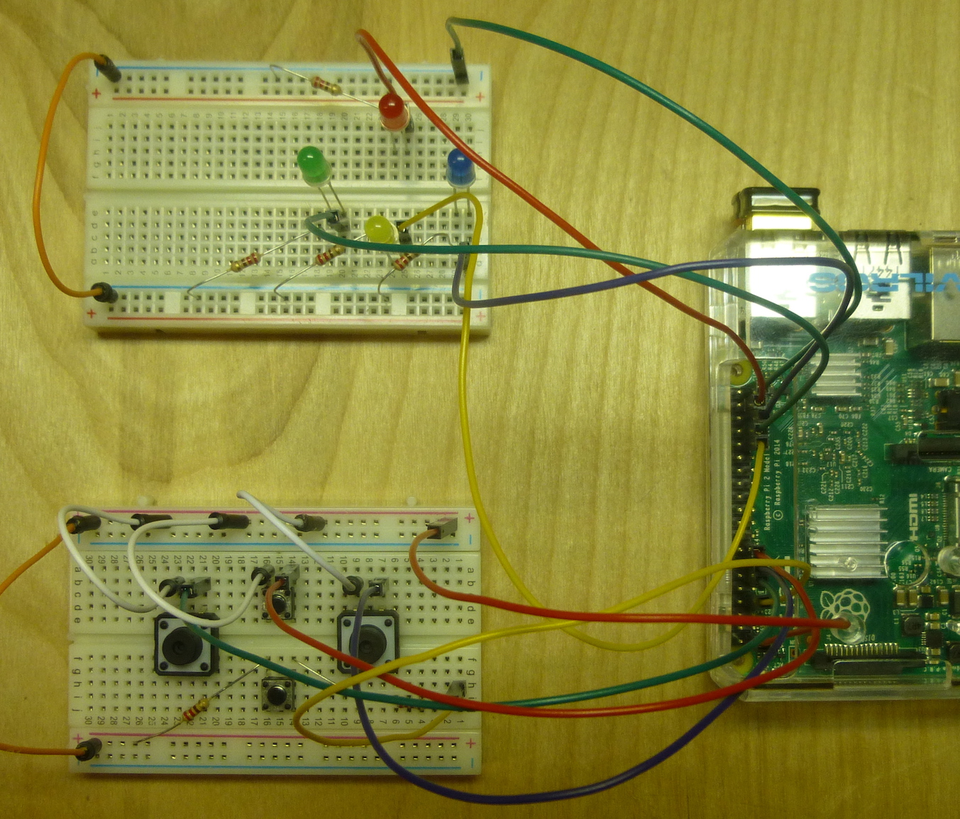 Here are images and diagrams of the circuit I created. It connects four GPIO pins to the buttons (to receive input when they’re clicked), and four more pins to the LEDs (to send out a signal to light them up).