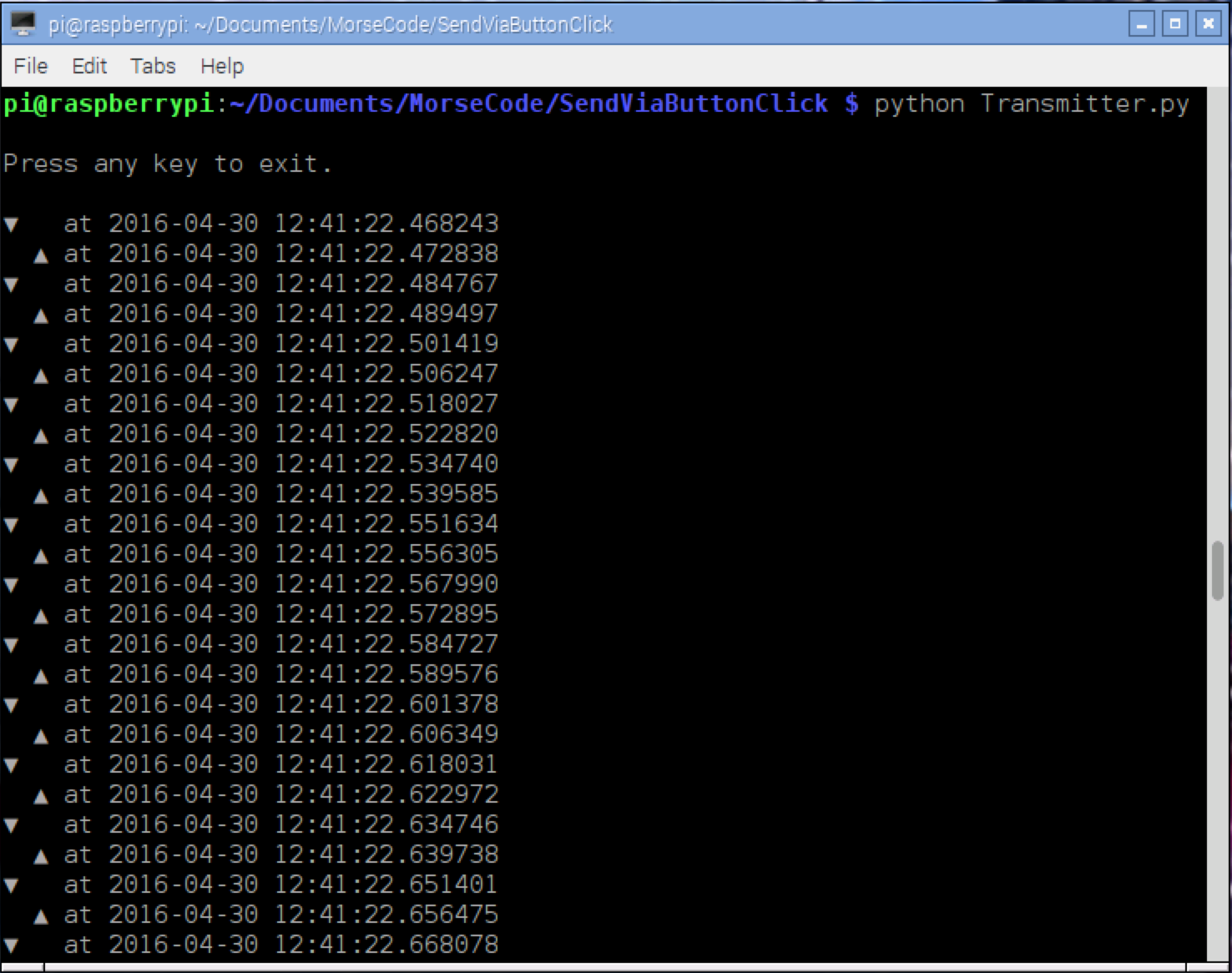 Running the above script, I’d expect to see a pattern of output like this, showing the timestamp for each time I press and then release the button.