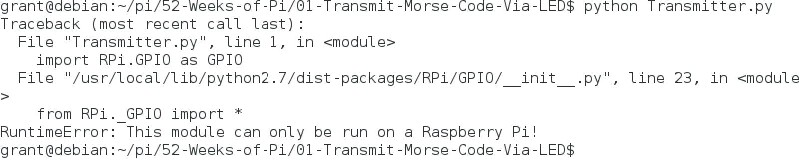Limitations: The RPi.GPIO library expects the GPIO pins to be available. If you’re not on the Pi, you can’t execute code that directly accesses them. It’ll complain loudly that you can only run your code on an actual Pi.