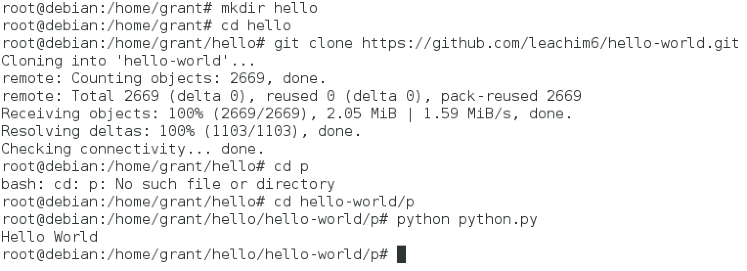 Create a new directory and clone “https://github.com/leachim6/hello-world.git”. Run the “p/python.py” file.