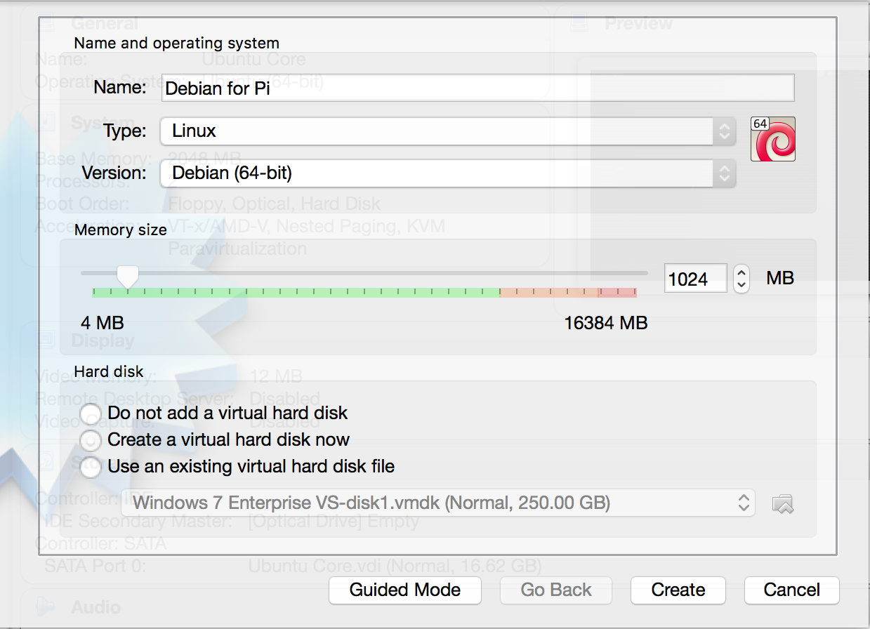 Set the settings according to the minimum requirements, which should pretty closely mirror the Pi. As of this writing, the current release is jessie. Using the graphical desktop, the recommended RAM and hard drive space is currently 1GB and 10GB, respectively.