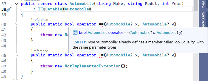 interface for us too, comparing the values of each property. In fact, if we define a record like this, calling out the IEquatable<T>