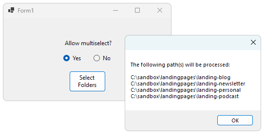 That’s it! I can’t decide if it’s stranger that it never had this capability, or that someone decided to add it now after all these years. Did something else change that made this a priority? Or is someone who’s been with WinForms since the very beginning retiring, and this was on their bucket list? Either way, we could only choose one folder at a time before, and now we can choose as many as we’d like!