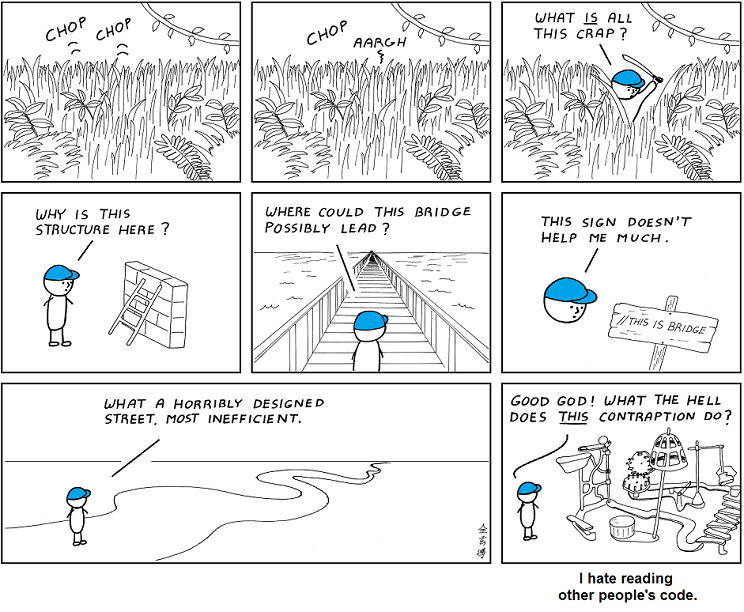 You, me, that next dev - we’re all the little guy in the blue hat… and we wrote the code he’s whining about! It’s missing a final pane where he realizes the project, mystifying as it seemed at first, actually has a goal - catch a mouse - and there’s no need to rewrite or delete it.