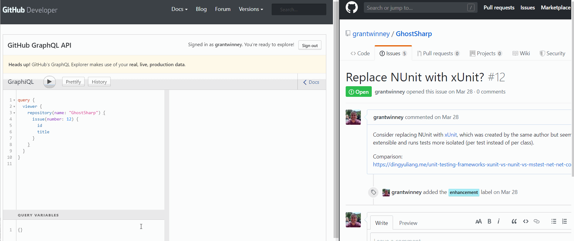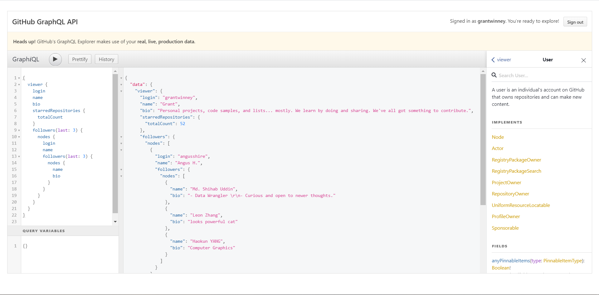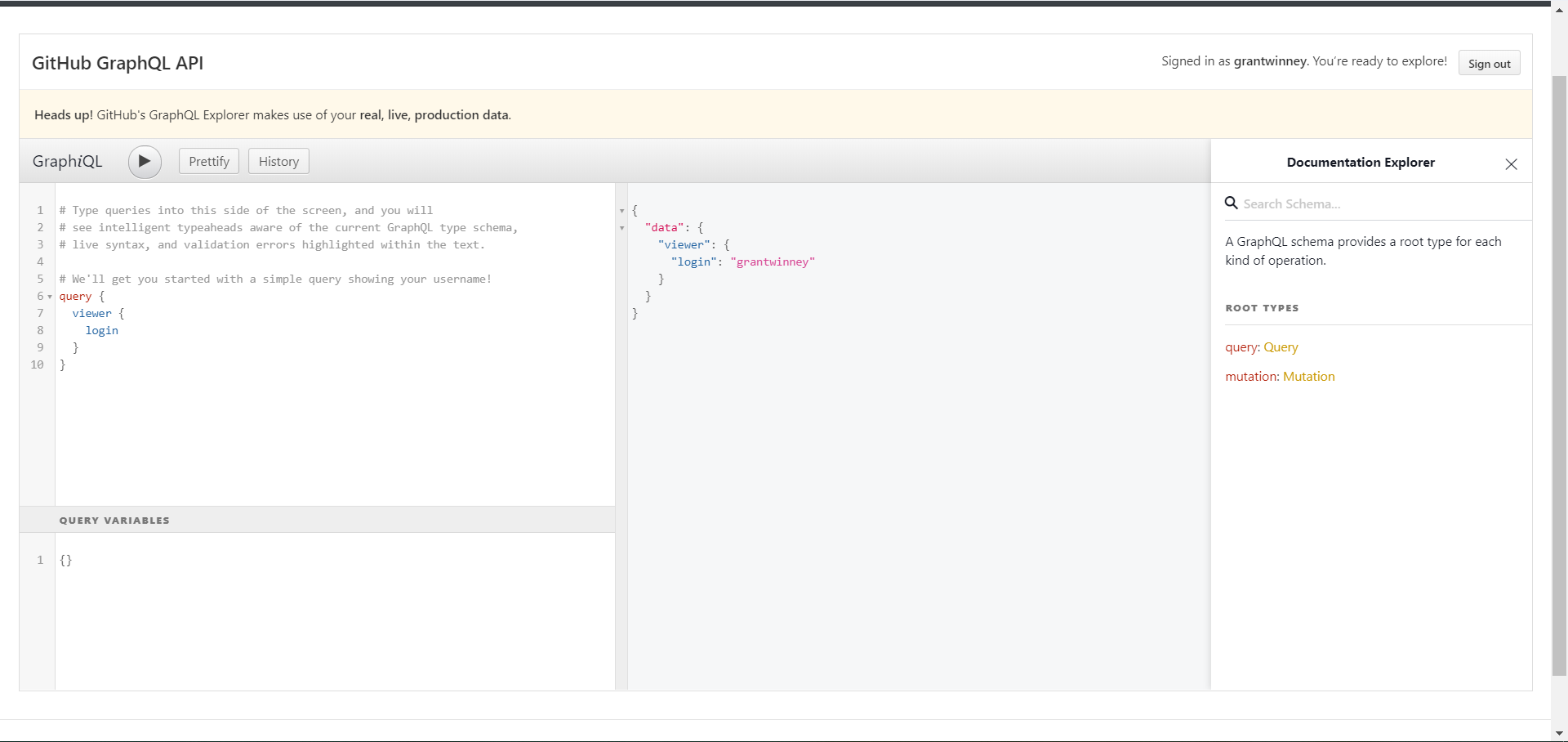 GraphiQL is a ready-to-go “API Explorer”. It integrates API docs right into the experience with “typeaheads” (similar to intellisense in Visual Studio), which helps us figure out what to query and then shows us the results. Let’s try out GitHub’s API explorer.