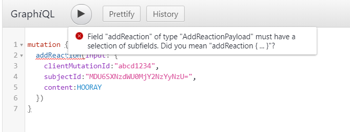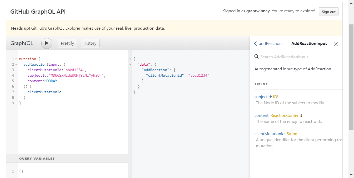 As with running the queries, having the documentation on the right side is great. I was able to drill down and see that addReaction
