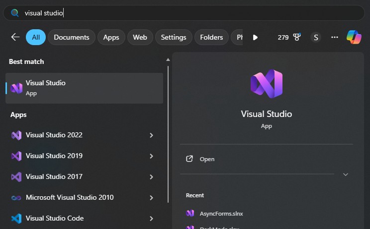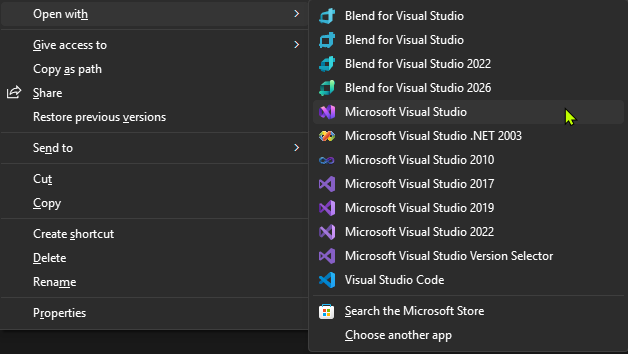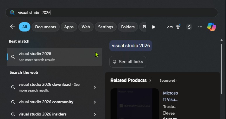 Right now, VS 2026 can’t be quickly found in the start menu. Typing “Visual Studio 2026” shows nothing, and typing “Visual Studio” shows every version of VS that’s installed (and VS Code). Maybe eventually as the older versions become unnecessary this won’t be an issue, but for now it’s annoying.