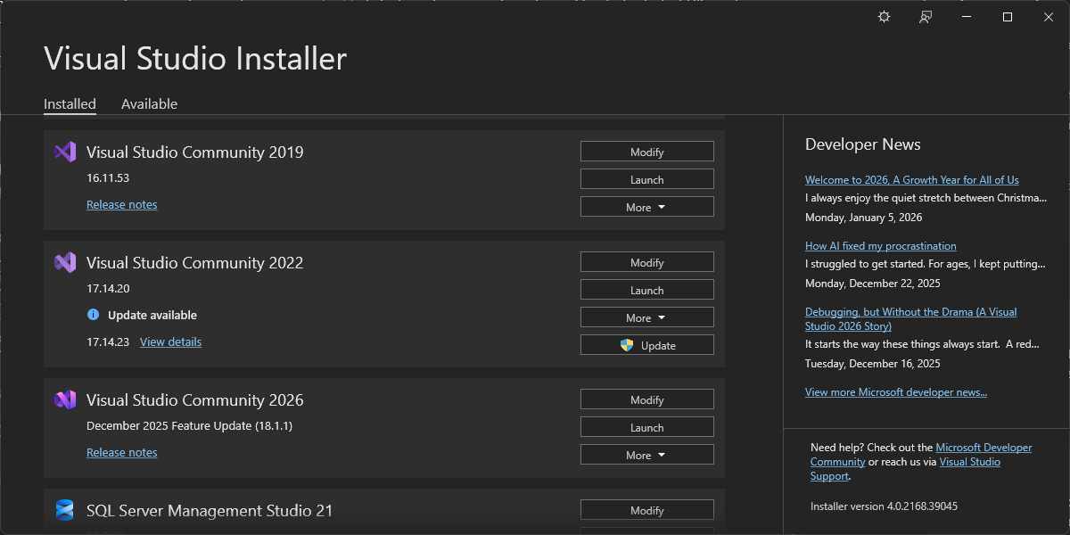 - Every November means a new version of Visual Studio (2026, 2027, etc), which will overwrite the previous one. No side-by-side installs.