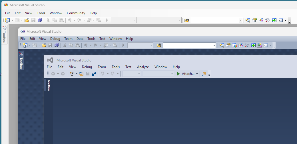 Microsoft has made poor design changes in the past, bad enough to make devs want to skip a version. Anyone here remember VS 2012? For reference, here’s VS 2005, 2010, and 2015, with a normal color palette, UI, and menus:
